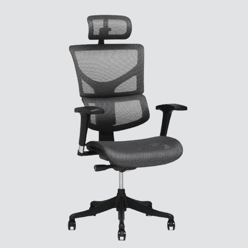 Executive revolving chair, adjustable headrest with mesh, back in black polymer frame and nylon mesh in the seat and back with adjustable lumber support, PU soft 3 directional armrests, nylon base with synchronize mechanism with tilt tension control.
