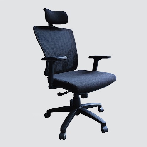 Executive revolving chair, adjustable headrest with mesh fabric, back in black polymer frame and nylon mesh with lumber support, seat upholstered in mesh fabric, PU soft adjustable armrest, nylon base with synchronize mechanism with tilt tension control.