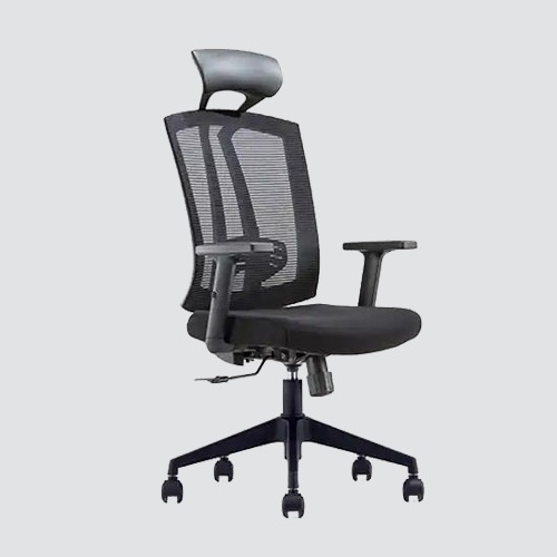 Executive revolving chair, adjustable headrest with mesh, back in black polymer frame nylon and mesh with lumber support, seat upholstered in mesh fabric, PU soft adjustable armrest, imported nylon base, synchronized tilt mechanism.