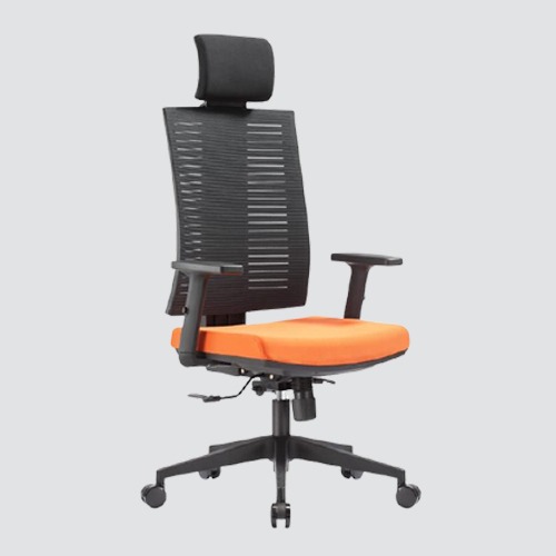 Executive revolving chair, adjustable headrest with mesh fabric, back in black polymer frame and nylon mesh with lumber support, seat upholstered in mesh fabric, PU soft adjustable armrest, nylon base with synchronize mechanism with tilt tension control.