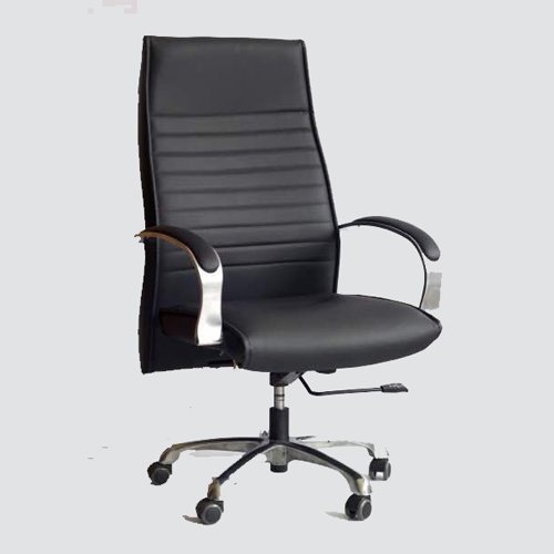 The executive revolving chair is upholstered in leatherette, has an aluminum disaster base, and the arms are padded with a leatherette, tilt mechanism with two stages lock.